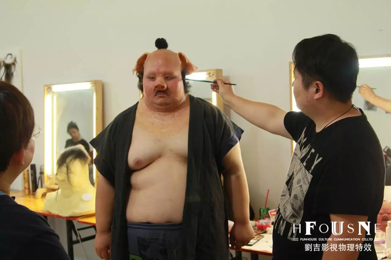 劉吉:肥猪猪妆面也经过了很多次的调整,从整体的塑形调整到局部塑形,最大程度上保留演员的表情,而且在猪鼻子和猪耳朵这些传统不能动的位置,我们特效化妆团队完成了机械制作,耳朵和鼻子都可以通过手柄操作完成动作,也是一个很大的突破。
